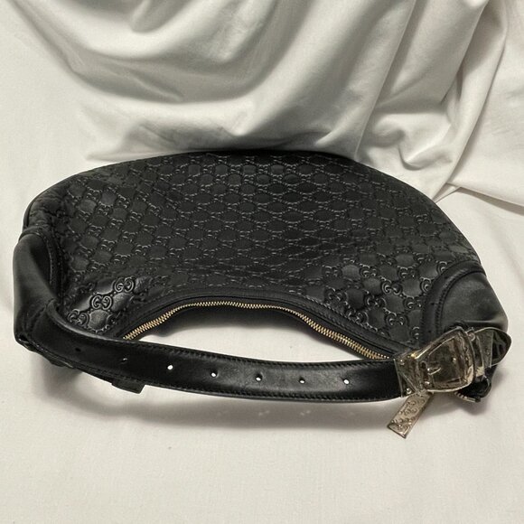 Gucci Leather Horsebit Embossed Buckle Hobo Shoulder Bag Black 145764