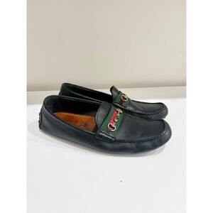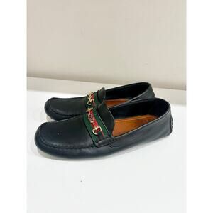 Gucci Leather Slip On Loafer Black with Gold Buckle and Red/Green Stripe Mens 11
