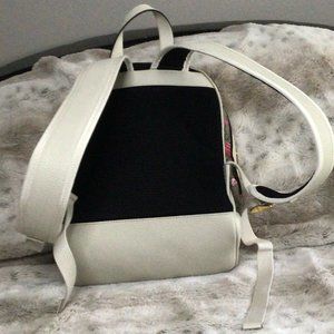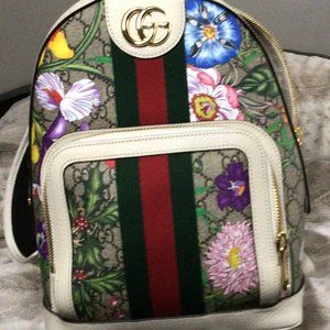This item is a leather purse size backpack, off white/light beige color (leather) multi color floral print over classic double G monogram, gold double G logo and zippers. The inside also beige in color, canvas with small pockets.