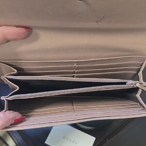 Chic Gucci wallet with iconic monogram design. Stylish and functional for daily use. Comes with Gucci booklet, and sticker Tag with product number and details. Does have some signs of wear, i.e., rubbing/ discoloration but no holes or tears. just needs a little TLC. Please see all pictures for full condition.
