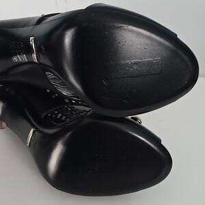 Striking Gucci Lika jeweled studded heeled booties crafted in black leather with multicolor cabochon stones and laser-cut detailing. These open-toe ankle booties feature intricate perforated cutouts, turquoise-style studs, and bold jewel embellishments across the strap. Finished with a slim high heel and Gucci logo stamp at the heel and insole. Size 40 (US 10).
