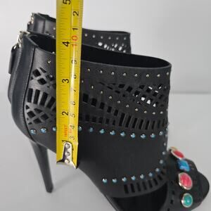 Striking Gucci Lika jeweled studded heeled booties crafted in black leather with multicolor cabochon stones and laser-cut detailing. These open-toe ankle booties feature intricate perforated cutouts, turquoise-style studs, and bold jewel embellishments across the strap. Finished with a slim high heel and Gucci logo stamp at the heel and insole. Size 40 (US 10).
