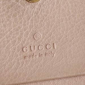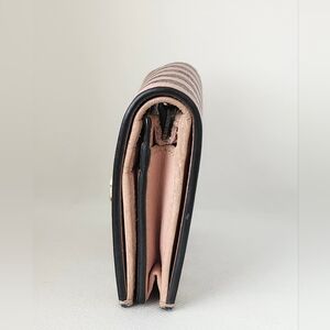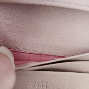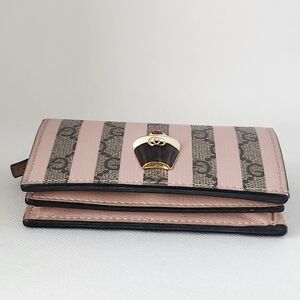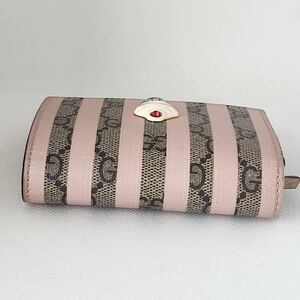 Limited edition Gucci compact wallet. Pink and beige striped with cupcake logo. Snap button opens to pink leather interior with zippered coin pouch, card slots, and bill compartment. Minimal signs of wear. Includes box and dust bag. Measures 4.25" x 3.25"