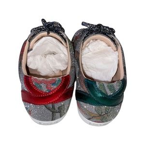 Beautiful Gucci Limited Edition sparkle sneakers with Blue Jay on right shoe and Red canary bird on left shoe design. These sneakers looks so sleek and beautiful on, they make the most simplest outfit pop. They especially stand out in the sun when the sneakers sparkle like diamonds. The sneakers are lightly worn and have been kept in mint condition with original packaging, stuffing, etc.rubber outsole, light weight, leather lined.