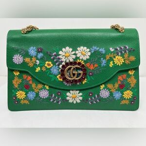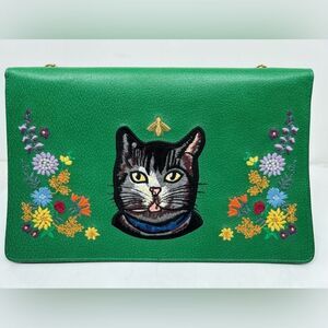 Gucci Linea Ricami Shoulder Bag Embroidered Leather Green Cat