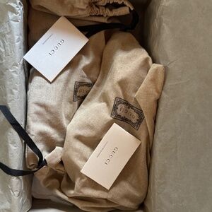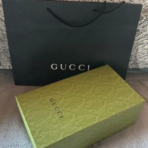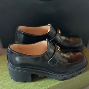 Authentic women's Gucci loafers size 38.5/8.5, black leather with gold small double G logo - chunk heel. Made and purchased in Italy. Purchase will come with the Gucci bag for the individual shoes as well as the Gucci box. Worn once - in great condition - some really slight smudging but like new otherwise.
