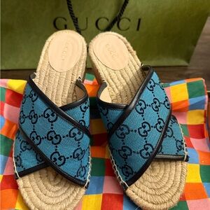 Beautiful blue and navy Gucci logo heels. Only worn once! Very cute for summer. Comes with original box and dust bags.