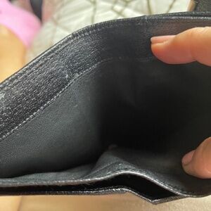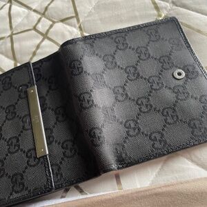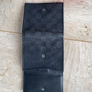 Will coordinate with Gucci handbag up for sale. Black canvas with leather trim and silvertone hardware. No scuffs, frays, tears or smells. Excellent condition. Could be considered men's or women's accessory. width 4 3/4" x 8 1/4" long. 5 cc holder left and right side on inside for total of 10. Double bi fold bill holder, with snap closure on outside for change or other small objects. no dust bag. No bids. Listed on realreal for 325.