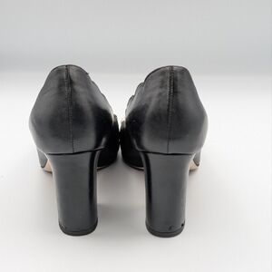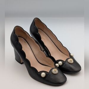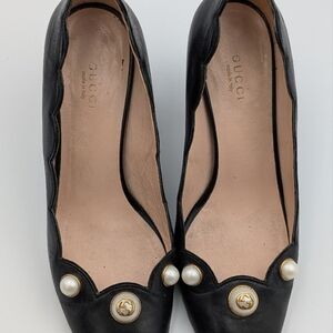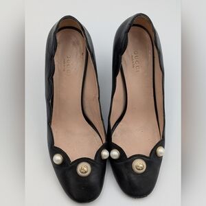 Gucci Logo Pearl Scalloped Pumps 37.5 / US 7.5 Black Leather Heels