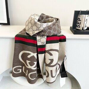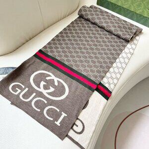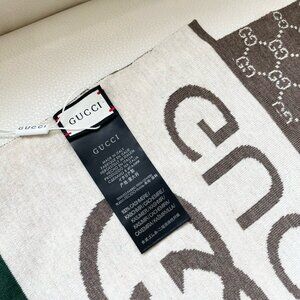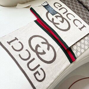 Stay stylish and cozy with this authentic Gucci scarf. It showcases the classic GG pattern, signature green - red - green web stripes, and bold Gucci branding. Made from soft wool, it's perfect for adding a touch of luxury to your cold - weather looks. In great condition, ready to elevate your accessory game.