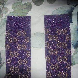 Made from a shiny lamé and cotton blend, these Gucci purple and gold socks feature the GG motif—a nearly 100 year old symbol. Material made of 60% cotton, 25% polyamide and 15% metallic fiber. Made in Italy.