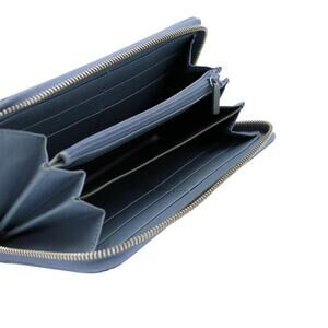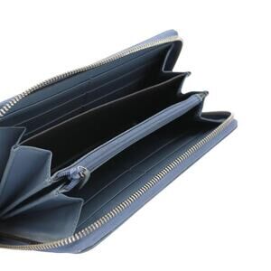 This Gucci elegant baby blue GG logo full around zippy is chic way to organize your essentials like your bills and cards with ease. It features GG leather trim and GG silver logo monogram with raw studded detail super cute. You won't want to leave home without it! The exterior canvas includes wear to the bottom corners. The interior has minor creasing throughout but is otherwise clean and in great condition.