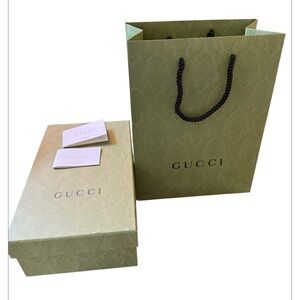 Gucci gift bag, Gucci shoe box, Gucci dust bag set, Gucci packaging, luxury brand box, designer shopping bag, high-end gift wrap, collectible Gucci, Gucci authenticity cards, Gucci storage box, luxury closet décor, Gucci accessories