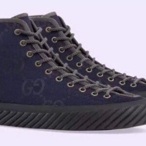 Flex your Fashion Game boasting these rare, Authentic Gucci Macro GG high-tops. Crafted in Italy with meticulous attention to detail featuring the signature New Blue GG Supreme canvas with black organic cotton uppers, these sneakers balance bold design with timeless sophistication. A lace-up closure ensures a secure fit, while the high-top silhouette delivers both comfort and style — perfect for athletic or elevated casual wear.