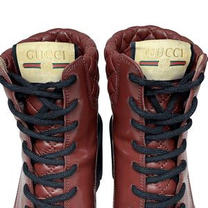 Make a bold statement in these Gucci Magnum Ankle Boots — a perfect mix of luxury and edge. Crafted in rich garnet red patent leather, these designer boots feature a chunky lug sole and block heel for confident, elevated style. The quilted ankle detail, black laces, and embossed Gucci branding add a sleek, fashion-forward finish.