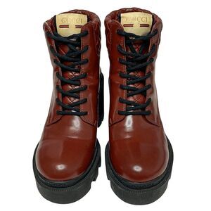 Gucci Magnum Garnet Red Patent Leather Lug Sole Lace Up Boots 37.5 Block Heel