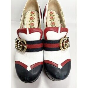 Gucci Malaga Kid Web Pearly GG Platform Loafer Pumps White Navy & Red Sz EU 37.5