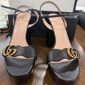 Gucci Marmont Black Platform Sandals Heels Leather GG Size EU 39 High Block Heel