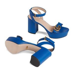 Gucci Marmont Blue Leather Gold G Logo Block Heel Ankle Strap Platform Sandal 36
