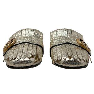 Gucci Marmont Logo Gold Crinkle Foiled Leather Fringe Slip On Flat Loafer Mules in excellent preowned condition. They were very well cared for and come from a non smoking, pet free home. All pictures are of the actual item, taken in house (no stock photos).
