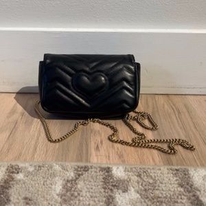 Authentic, lightly used Gucci leather cross body mini bag in black chevron. Excellent condition with very little sign of wear--no major/obvious flaws. Care card, box, ribbon, dust bag all included. Key ring on inside (if you want to attach it to a larger bag).