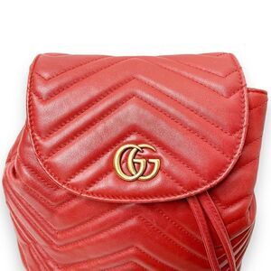 The Gucci Black Marmont Quilted Leather Backpack in Red features adjustable shoulder straps with post-stud fastening. Logo plaque at face. Fold over flap with magnetic tab fastening. Drawstring fastening at throat. Patch pocket and leather logo flag at interior. Leather lining in beige. Antiqued gold-tone hardware. Tonal stitching.
