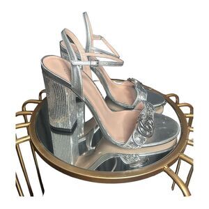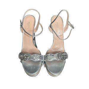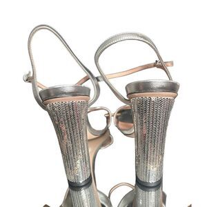 Size 41. Great condition. Any scuffs or imperfections shown. Sequinned silk heeled sandals in silver-tone. Tonal grained leather trim throughout. Open round toe. Logo hardware at vamp. Adjustable pin-buckle ankle strap. Silver-tone logo stamp at beige leather footbed. Tonal covered block heel. Leather sole in beige. Silver-tone hardware. Approx. 4 heel. Upper: