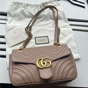 Iconic double GG marmont bag in taupe leather, soft matelassé leather. Light gold toned hardware, sliding chain strap can be worn as a shoulder bag, crossbody, or top handle. The dimensions are 10”W x 6” H x 3” D. Fits a long/large wallet, AirPods, lipsticks, and even a small book/kindle!
