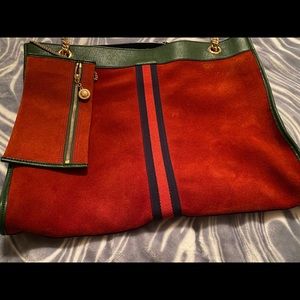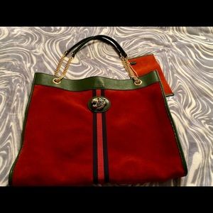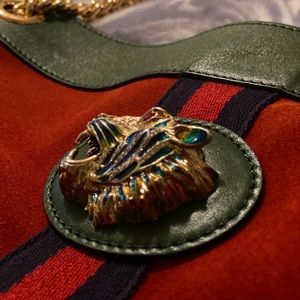 Gucci Medium Suede Rajah tote bag with gold-tone hardware, dual chain-link shoulder straps with leather shoulder guards, hunter green leather trim, crystal-embellished lion head spur adornment at front face, tonal leather lining and open top. Includes accompanying zip pouch.