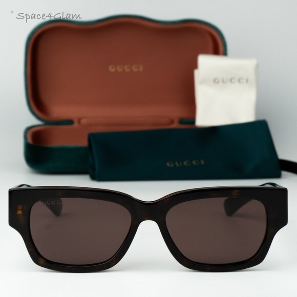 Gucci GG1794S 002 sunglasses showcase a classic havana square frame made from eco-friendly recycled acetate and paired with brown bio-based polyamide lenses. This versatile unisex design offers full UV protection, durability, and premium comfort, making it a stylish choice for everyday wear or special occasions.
