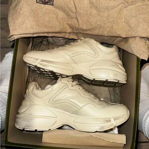 Step out in style with these Gucci men's sneakers. Featuring a sleek cream color, these shoes offer both comfort and luxury. Perfect for any occasion.