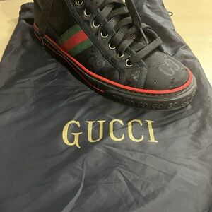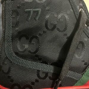 Authentic Gucci Men’s Off The Grid Monogrammed High Tops in tone on tone black, red and green.