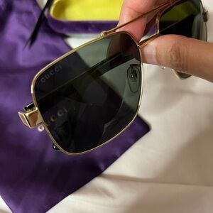 Stylish Gucci sunglasses for men. Black lenses with gold frames. Perfect for a sophisticated look.