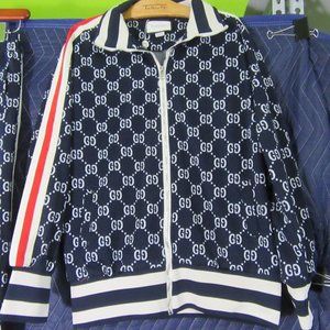 Gucci men's sweat suit size x-large. Jacket is a zip up with a working zipper. Came from an estate; is odor and pet free. In excellent condition. Primarily blue with white accents and red and white striped sleeves on the jacket and down both sides of the pants.