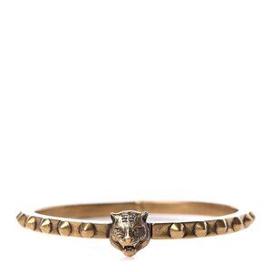 The Gucci Metal Studded Feline Head Bracelet in Aged Gold is crafted of an aged gold-tone metal in Italy. This bangle style bracelet features a feline head at the center, metal studs throughout, and a hinge style closure.