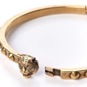 Gucci Metal Studded Feline Head Bracelet in Aged Gold