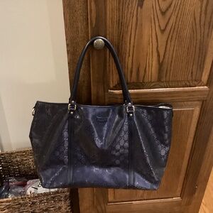 Authentic pre-owned metallic blue Joy tote, 18”W x 11 1/2”H x 5”D, with embossed serial #. Bag is in great condition with no signs of wear. Certificate of Authenticity included.