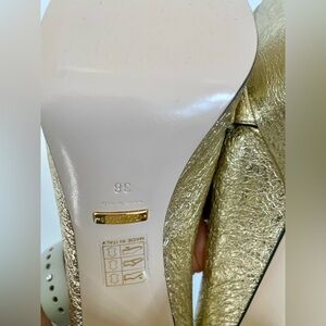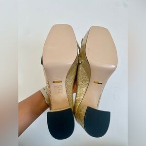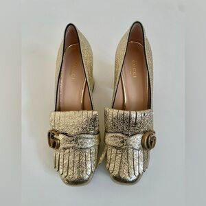Gucci Metallic Gold Marmont GG Platform Platino Fringe Logo Block Heel pumps 38