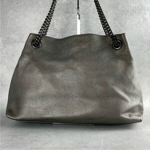 Chic Gucci shoulder bag in metallic gray leather. Features chain straps and embossed logo. Ideal for stylish outings.