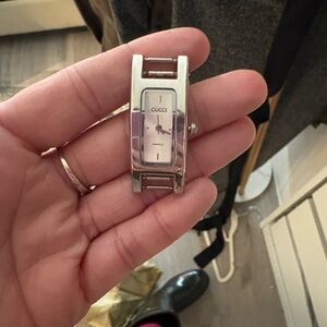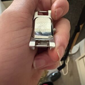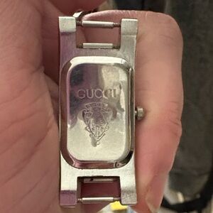Chic Gucci watch with a metallic silver finish. Rectangular face with minimalist design.