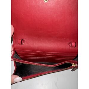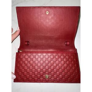 This elegant Gucci crossbody wallet features the iconic Microguccisima pattern in a rich red leather. It is in excellent condition, offering functionality with style. The wallet includes multiple card slots and a zippered compartment, with a detachable strap for versatile use.