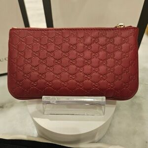 Red Gucci Microguccissima Key Pouch. Excellent preowned condition. Comes with box and dust bag. The last two photos are to demonstrate to size. This one is larger than the common key pouch.