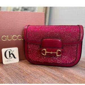 Brand new in box, this Gucci Mini Horsebit 1955 bag features a shimmering pink crystal-studded body, lizard leather sides & trim, and with gold horsebit hardware. A standout in any collection, this mini crossbody blends iconic Gucci styling with bold sparkle. Includes box and dust bag.