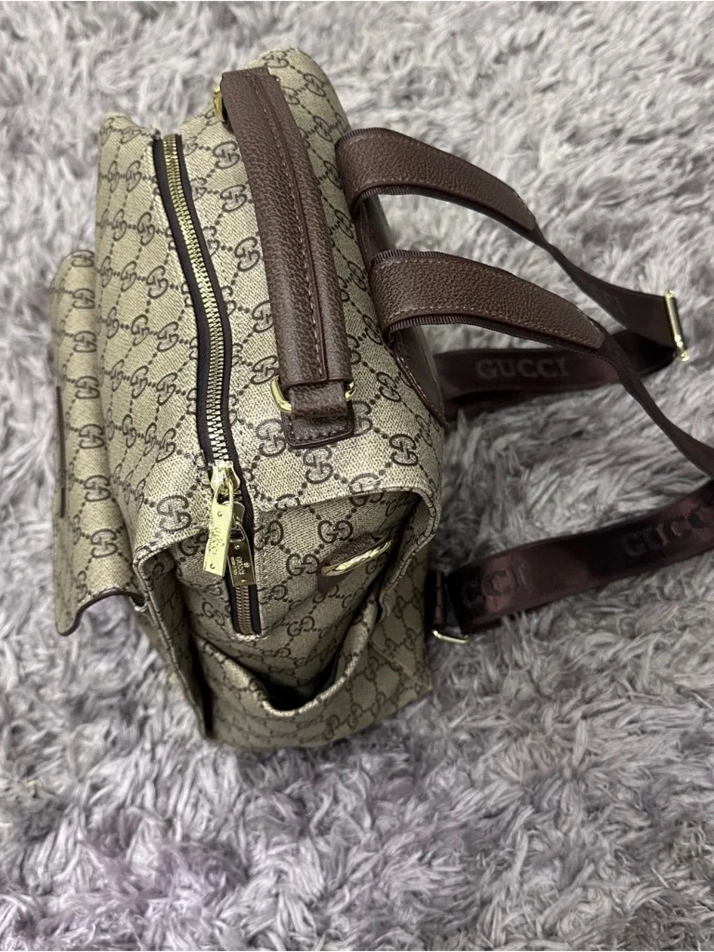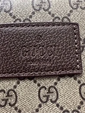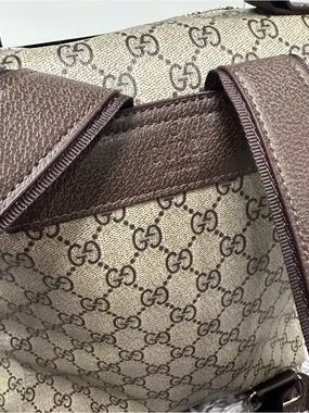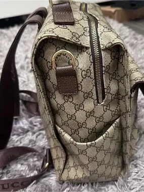 Gucci messenger bag in signature monogram canvas. Beige canvas body with brown leather trim and adjustable straps. Gold-tone zipper and hardware details. Practical front pocket and roomy interior.