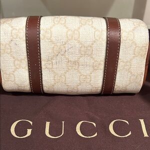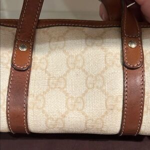 Gucci mini Boston leather bag. Features cream colored monogram Gucci pattern with brown leather trim. There are a few marks pictured. Zipper works and it is fully functional. I have gotten many compliments on this bag! It can hold a large iphone and a small wallet. 100% Authentic Gucci. Dimensions approximately: 7" x 3.5" x 3.5"