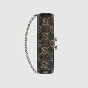 Reminiscent of an archival symbol, the textured tiger head spur is the Dionysus' defining feature. The feline appears throughout the universe, expressing the House's fascination with the wild beauty of the natural world. Here, the antique silver-toned hardware is paired with a black and ivory GG denim jacquard.