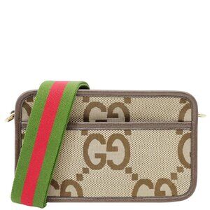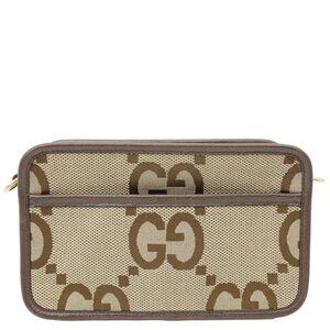 The GUCCI Mini Jumbo GG Canvas Crossbody Bag in beige features the iconic GG canvas pattern with leather trim and a compact design. This stylish crossbody offers a zippered closure and a detachable strap for versatile carrying.
