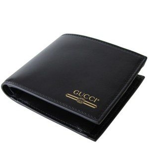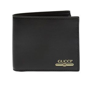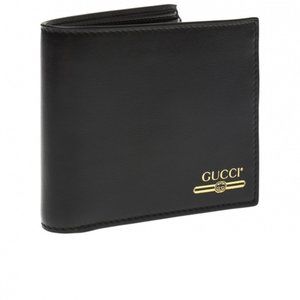 The Gucci Mini Print Logo Leather Wallet With Coin Pocket in Black is crafted from smooth calfskin leather in Italy. This bi-fold wallet features a metallic gold printed logo in the corner and opens to 4 card slots, 2 bill folds, and 1 coin pouch.