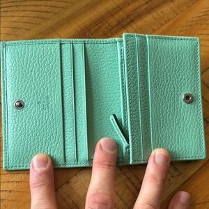 Stylish and supple Gucci wallet crafted in exquisite in a minty teal leather. Has 6 credit card slots, a coin pouch, and a pocket for bill. Also had a secret pocket. Made in Italy. Comes with box, pouch, and tags!