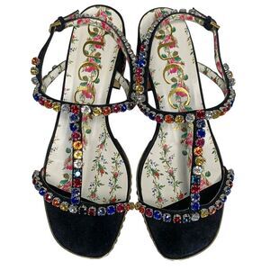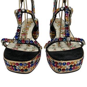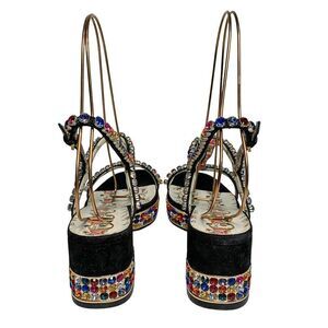 Make a bold statement with the Gucci black suede platform and heeled strappy sandals, embellished with a sparkly array of multicolor crystals. These eye-catching sandals feature a luxurious black suede base, paired with intricate straps that wrap elegantly around the ankle for a flattering silhouette. Perfect for a night out or special occasion, these Gucci sandals embody the brand's signature blend of opulence, sophistication, and modern glamour.